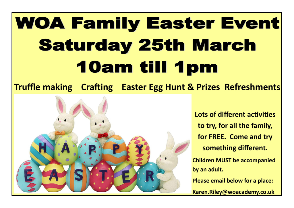 We have our Family Easter Event on Saturday 25th March from 10am till 1pm. Everyone welcome, but all students have to accompanied by a parent. Please see poster for details. If your family wish to attend please email [email protected] for a place by Friday 24th March.